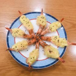 6. Put all the shrimps on the mashed potatoes and sprinkle with cheese and black sesame seeds..
