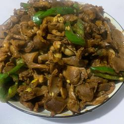 6. Fry the chicken gizzards out and add the chopped ones Chili shreds, stir well, add thirteen incense, salt, light soy sauce, oil, dark soy sauce, stir it for a few times and take it out