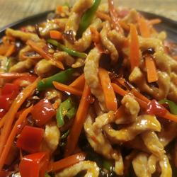 9.Ingredients: Add carrot shreds, fungus, green pepper, stir-fry evenly, then add oil-coated pork shreds and stir-fry evenly