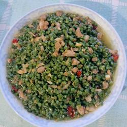 1.Pork, beans , ginger, garlic, and dried chili peppers all chopped into pieces.Salt, sugar, chicken essence, light soy sauce, dark soy sauce, and oil are used to make a juice for later use