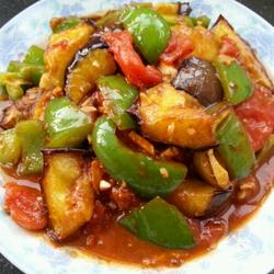 • Illustration of how to cook eggplant 44.Add green pepper slices and stir-fry evenly