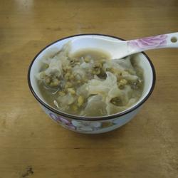 4. Boil over low heat for 40 minutes, close the lid and simmer again.Then add white fungus, turn to high heat and bring to a boil, add 150 grams of sugar.Bring to a boil, turn off the heat and let cool for a while, the mung bean and white fungus soup is ready