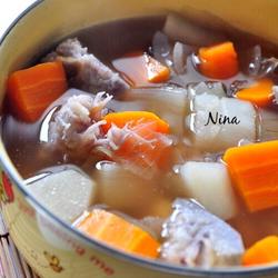 5. Then add white radish, onions, and carrots, and simmer for about 25 minutes.Vegetables All became soft.