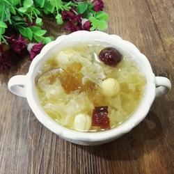 7.Put peach gum, white fungus, lotus seeds, lily, red dates and water into a casserole , bring to a boil over high heat, then reduce to low heat and continue to cook for 1 hour.At this time, the soup begins to become a little thicker.Add rock sugar and cook for 3 minutes while stirring, until the rock sugar melts completely and the soup becomes thick.