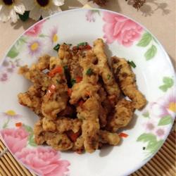 5. Fry until golden brown, pour out the oil, leave the fried tenderloin in the pot, and sprinkle with Add salt, pepper, red pepper and chopped green onion.Turn the pot to coat the tenderloin evenly with salt and pepper.Remove from the pot and place on a plate.