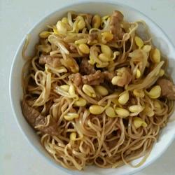 4. Heat oil in a pot, stir-fry the meat until cooked, add salt to taste, add bean sprouts to the pot, stir-fry, add water and simmer for 15 minutes