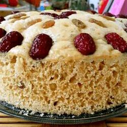 6.After fermentation, there will be an obvious honeycomb shape.Spread a layer of red dates and raisins on the cake