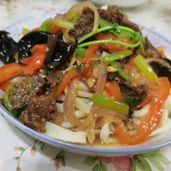 7. Heat oil in a pan and add minced garlic and ginger.Sauté millet pepper foam and Sichuan peppercorns, then add marinated beef slices.Stir-fry for 5 minutes.Add shredded onions, colored peppers, and parsley.Add an appropriate amount of warm water.After frying for 5 minutes, add an appropriate amount of light soy sauce.Oil chicken essence and it is ready to serve.