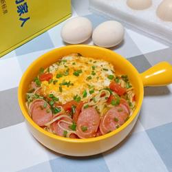 13.Put in the fried eggs, cover and cook until the noodles are medium cooked