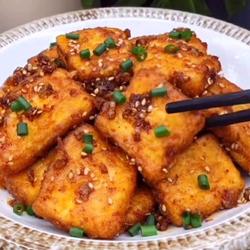 5. Leave the oil in the pan, add the fried tofu and spread it out, sprinkle with the prepared sauce and stir evenly