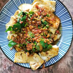 Tofu does not need to be boiled, just rinse it with water, then cut it into pieces and put it in the pot, fry it until golden brown on both sides Get out of the pot! If you like spicy food, you can add more chili!