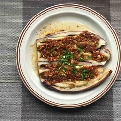 4.After roasting for three minutes, take it out and use chopsticks to break up the eggplant meat