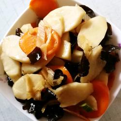 4. Pour oil into the pot, add scallions and white garlic and saute until fragrant, then pour in yam Stir-fry carrots and fungus over high heat for 3-5 minutes, add salt and soy sauce and stir-fry evenly