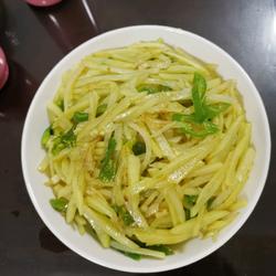 4.Pour in the soaked shredded potatoes and stir-fry , add salt and chicken essence after all oiling, and add natural fresh soy sauce to enhance the flavor before serving~