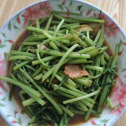 A very simple dish.Add oil, heat the oil to 70% and stir-fry the meat.Add sauce and soy sauce.Add chrysanthemum, green onion, ginger and garlic.Stir-fry.Add chicken essence and thirteen spice salt.The chrysanthemum will become watery.No need to add water.When there is a little soup left, the taste will be just right.The pot is over