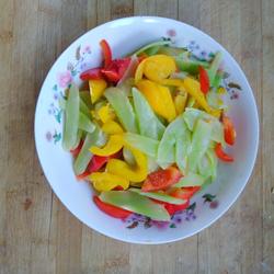 3.Add lettuce, green and red peppers and a little sugar.Stir fry over high heat for one minute.