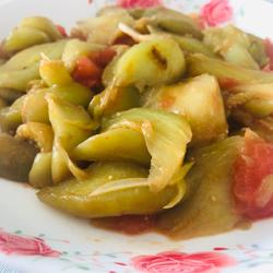 6. After the eggplant changes color, add tomatoes and continue to stir-fry, then add appropriate amount of salt.