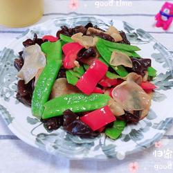 1. Prepare the ingredients.Black fungus, white fungus, snow pea, colored pepper, garlic.Black and white fungus need to be soaked for 2 hours in advance.