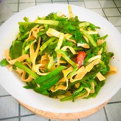 1. Cut the bean skin into shreds, put it into the pot, cook for about 1 minute, remove and drain dry moisture.