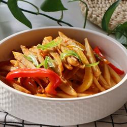 7.Put in colored peppers , xylitol, white pepper, a little Vida rock sugar and dark soy sauce for color, a little water, stir-fry for one minute