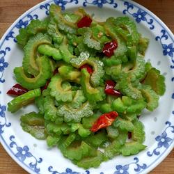4.After the oil is cooked, add the bitter melon slices and stir-fry, add salt, cooking wine and light soy sauce and stir-fry for one minute over medium heat