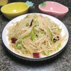 8.Wash and filter, put green pepper shreds, garlic and chili pepper on top of potato shreds.
