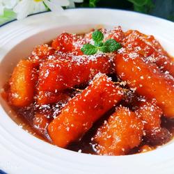 12.As the syrup slowly cools, the color of the pumpkin will become darker and darker., you can see the sugar threads, and you can pull out the long golden threads by picking up the pumpkin