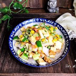 6.Add cooked three-color diced vegetables and stir-fry until thoroughly seasoned
