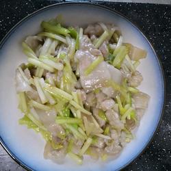 4. Heat oil in a wok, add yellow leeks and meat slices, and add shrimp oil , MSG, cooking wine, and a little sugar, stir-fry.