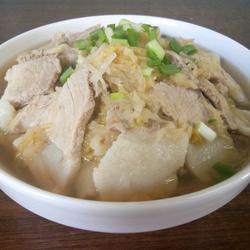 6. Then put the sauerkraut and pork slices into the pot together, and then add the original broth , add 10 grams of salt, 10 grams of light soy sauce, and 10 grams of chicken essence, and simmer over high heat for 30 minutes.