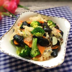 8. Add the fungus and white fungus, pour in the cooking wine and stir-fry.