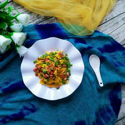 4. Cut the ham into cubes, add a little salt to the eggs in a bowl, and stir evenly.