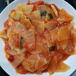 1.Soak potato slices in water and cut tomatoes into cubes.