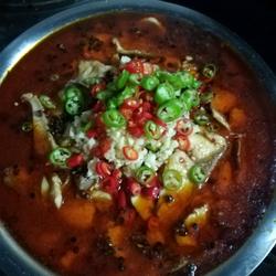 6. On the fish, place Sichuan peppercorns, peppercorns, dried chili peppers, minced garlic, green and red peppers in order, heat the oil in a pan until Pour 80% hot over the above ingredients.
