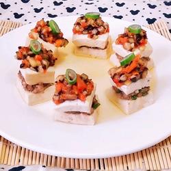 4. Put the tofu on the plate, put the meat filling on each one, and spread it evenly.