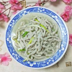 6. Heat oil in a pot, add onion, ginger and garlic and sauté until fragrant, then add water (it would be better if you have bone broth), salt, MSG, chicken essence, White pepper, add shredded pork and green garlic