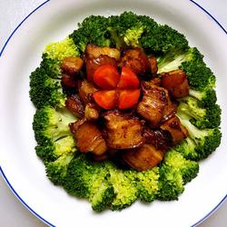 11.Put the cooked braised pork in the middle of the broccoli, and finally add a cherry tomato
