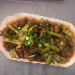 4. Stir-fry the duck until fragrant, pour in beer, simmer for 10 minutes and add in green pepper and green beans,