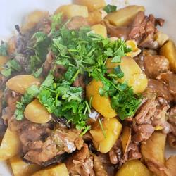 7.After the chicken is stewed, add potatoes and quail eggs and simmer for ten minutes, then add vermicelli to collect the soup