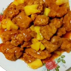 7. Leave a small amount of base oil in the pot, add the correct sauce, stir-fry until foaming Add the fried meat pieces, stir-fry the pineapple evenly, put it on a plate, drizzle with a little light oil, and serve.
