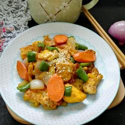 9.Finally add the green pepper and stir-fry quickly until cooked and ready to serve