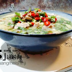 12.Cook the meat slices and put them into a bowl with the soup, add an appropriate amount of chopped chives, Add minced coriander, red pepper, and four small dried chili peppers.Heat the pot and add sesame oil to fry the Sichuan peppercorns until they are fragrant.Remove the Sichuan peppercorns and pour them on top while they are still hot.The delicious boiled meat slices are completed.