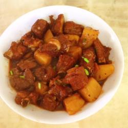 6.Pour in star anise and bay leaves and simmer over medium heat for 40 minutes7. Add potatoes, light soy sauce and dark soy sauce, and continue to simmer for 10 minutes.Sprinkle a little salt, MSG and pepper.Pour in the green onion segments, continue to simmer for 2 minutes, turn to high heat to reduce the juice and sprinkle with chopped green onion