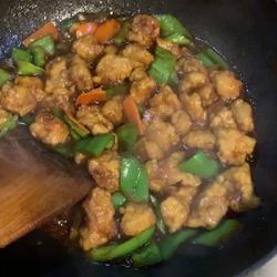1. Cut the pork loin into dice pieces, slice the green pepper and carrot and set aside