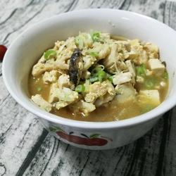 10.Add tofu and fried cod pieces and simmer over medium heat for about ten minutes.When the soup is simmered until thick, add an appropriate amount of light soy sauce, water starch, and a few drops of sesame oil and mix well.