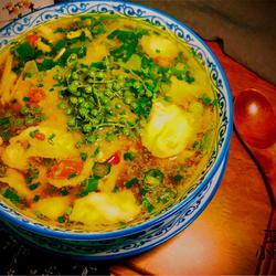 14.Pour the soup and water into the serving basin, sprinkle Add minced garlic and green onions.
