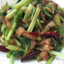 10. After stir-frying for a minute or two, pour the celery leaves into the pot and add Add salt, MSG and chicken essence and stir-fry for about two minutes.