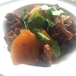 15.Place the beef Place on a plate, garnish with coriander, and the delicious beef stew with potatoes is ready.