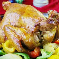 6. After the whole chicken is roasted, take out the turning fork, place the side dishes on the bottom, and place the whole chicken The central government is done.