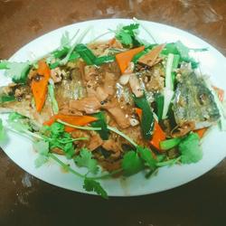 4.Clean the pot, add lard to the hot pot, add ginger and garlic Stir-fry until fragrant, add dried bamboo shoots, stir-fry, add mushrooms, carrot slices, shredded pork, stir-fry, add tempeh, light soy sauce, cook in cooking wine, add an appropriate amount of water, simmer the dried bamboo shoots and other ingredients for 2 minutes and wait for the bamboo shoots Add the sea bream and simmer for another 1 minute.Scoop up the fish, reduce the juice over high heat, add the water starch, pour in the tail-wrapping oil, sprinkle in the green onions, pour the juice on the fish, arrange it into a shape, and put coriander on the edge.